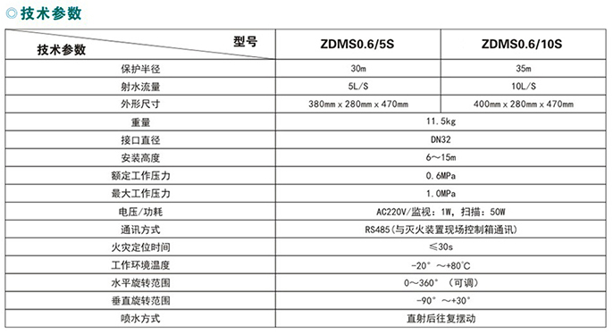 国内常用的是流量为5L/S,保护半径35M,详细参数如下: